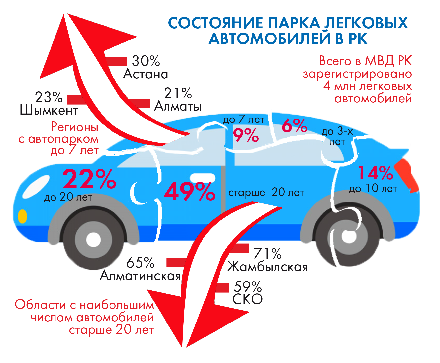 Больше всего доживает свой век автомобилей в Алматинской (84 %), Жамбылской (87 %), и Жетысуской (86 %) областях. В Алматы – 63 %, в Шымкенте – 57 %.
