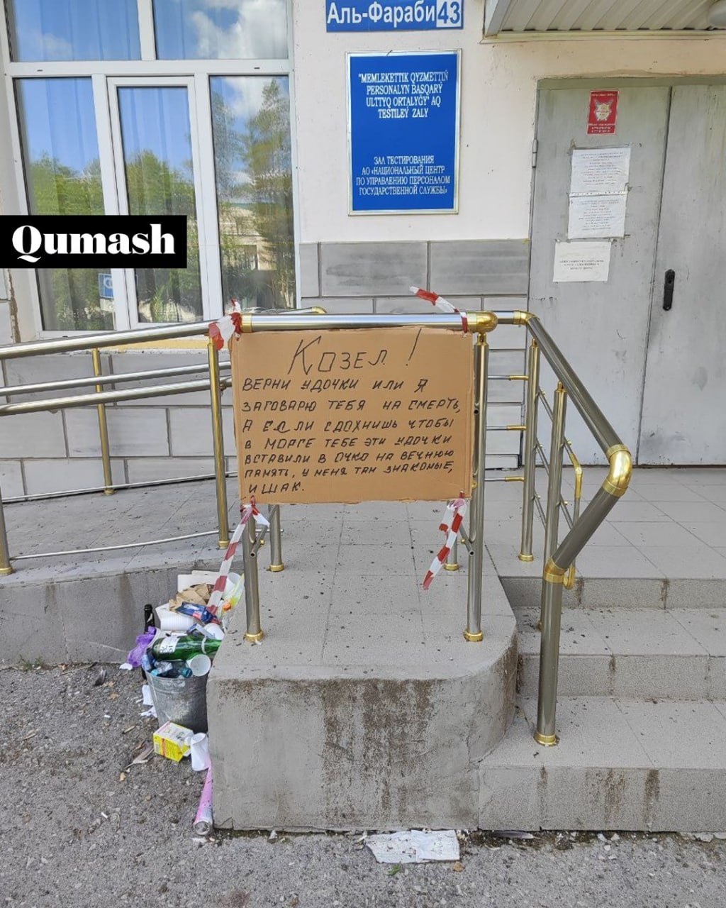 "Установлен автор таблички с надписью, содержащей слова, выражающие неуважение к окружающим и нарушающие общественный порядок. Им оказался местный житель, 1962 года рождения. Причину такой художественной самодеятельности мужчина пояснил тем, что в начале июля он оставил без присмотра две удочки возле дома по проспекту Аль-Фараби, 43, про которые он упомянул в своем обращении. Через некоторое время он обнаружил пропажу", — сообщили в пресс-службе департамента полиции региона.