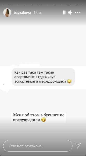 "Больше я экспериментировать не буду, вообще. Одной шляться там", — подытожила она рассказ, а после этого показала, что подписчик ей написал: "Как раз таки там такие апартаменты, где живут эскортницы и мефедронщики". На это Байзакова ответила: "Меня об этом в букинге не предупредили".