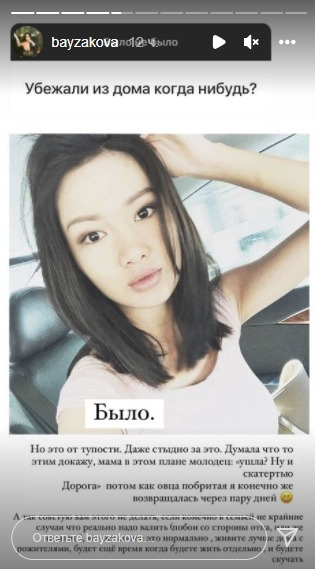 Байзакову спросили, сбегала ли она когда-нибудь из дома. Блогер ответила: "Было. Но это от тупости. Даже стыдно за это. Думала, что-то этим докажу, мама в этом плане молодец: "Ушла? Ну и скатертью дорога". Потом как овца побитая, конечно же, возвращалась через пару дней. А так советую вам этого не делать, если конечно в семье не крайний случай, что реально надо валить (например, побои). Живите лучше дома с родителями, будет ещё время, когда будете жить отдельно и будете скучать".
