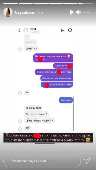 "Люблю моих подписчиков, которые до сих пор пугают меня сливом моих сисек", — подписала Байзакова скриншот. На нём подписчик угрожает ей выложить фотографию на всеобщее обозрение, но блогершу это не впечатлило. Она напомнила ему, что фотография уже два года есть в Интернете, и неоднозначно продемонстрировала, что её это не заботит.