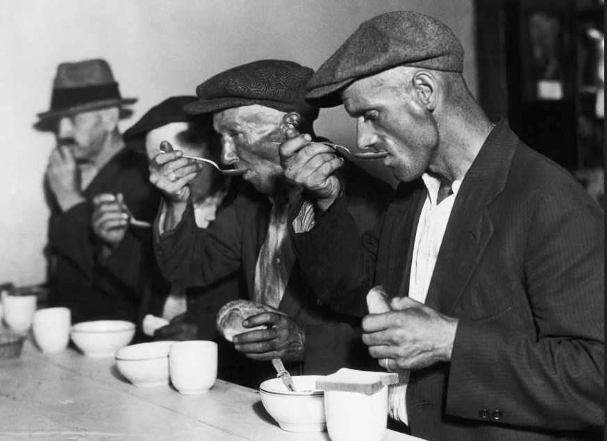 Настоящим символом Великой депрессии стали очереди за бесплатным супом. Правительство выискало средства, чтобы обеспечить людей питанием, но при этом о разносолах речи не шло. Сохранился даже рецепт того самого супчика.