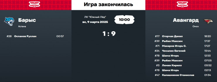 Уже в конце первой минуты встречи Руслан Оспанов забросил шайбу в ворота «Авангарда». Но на этом хорошие новости для астанчан закончились — следующие девять раз цель поражали только соперники.