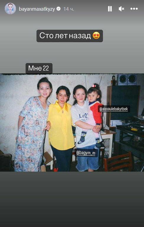 Фото подписано как "100 лет назад. Мне 22", передает медиа-портал Сaravan.kz. Сейчас продюсеру 49 лет. Маленькая девочка на фото — это Айсауле Бакытбек, старшая дочь Баян Алагузовой и Бахытбека Есентаева.