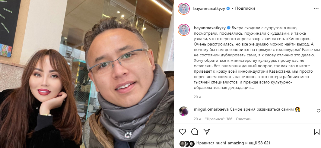 Продюсер высказалась: "Вчера сходили с супругом в кино, посмотрели, посмеялись, поужинали с кудалами, и также узнали, что с первого апреля закрывается сеть «Кинопарк». Очень расстроилась, но все же, думаю, можно найти выход. А почему бы нам не договориться напрямую с Голливудом? Разве мы не состоянии дублировать сами, я, к слову, отлично это делаю. Хочу обратиться к министерству культуры, прошу вас не оставлять без внимания данный вопрос, так как это в итоге приведёт к краху всей киноиндустрии Казахстана, мы просто перестанем снимать наше кино, а это потеря рабочих мест тысячей специалистов, и прежде всего культурно-образовательная деградация…"