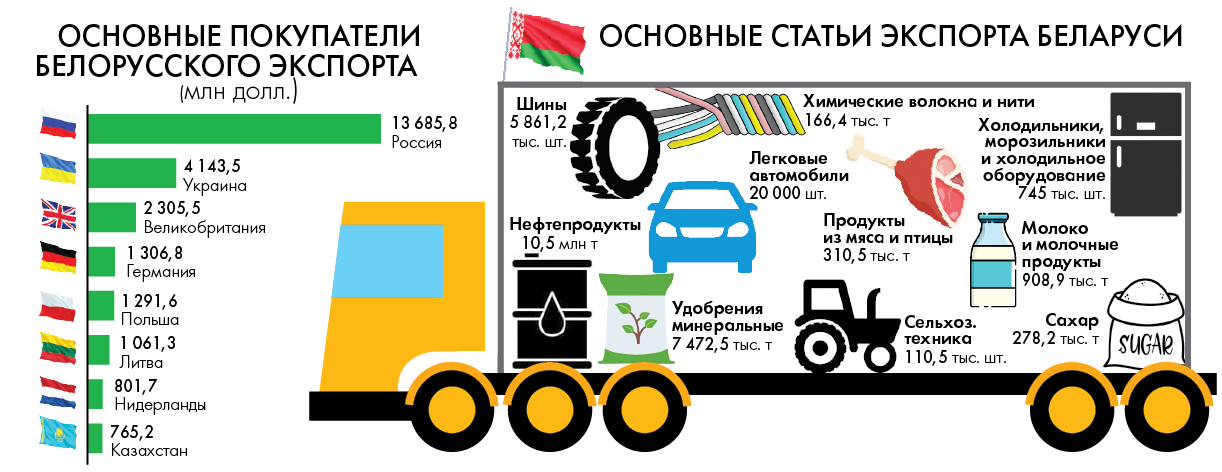 Кто же покупает весь этот продукт? Главный торговый партнер – Россия. На нее приходится половина всего внешнего торгового оборота страны. На втором месте – Украина. Ближайший сосед. Кроме того, Минск часто выступает посредником между Россией и Украиной.