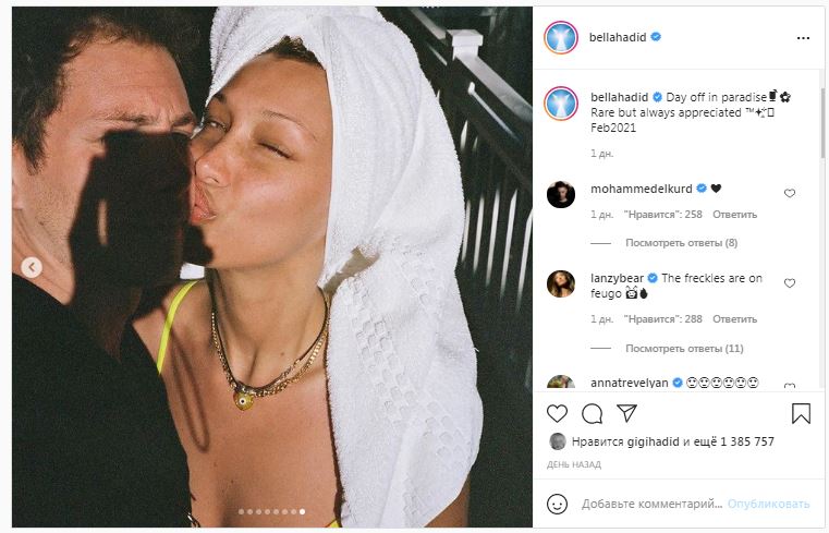 — Выходной в раю, — именно так подписала Белла свой пост, добавив, что она очень ценит подобные редкие моменты.