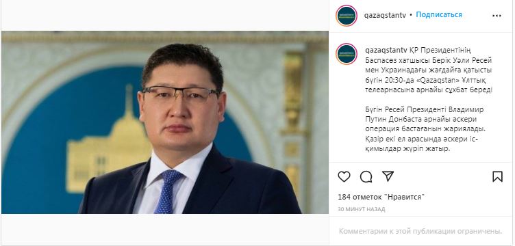 — Также Берик Уали ответит на вопросы о позиции Казахстана по данному вопросу, а также о событиях января , — отмечено в сообщении Qazaqstan.tv.