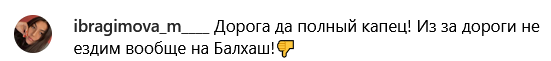 "Если вы собрались отправиться летом на уникальное озеро Балхаш, то вас ждёт незабываемая дорога типа «стиральной доски» протяжённостью 80 километров, так что берите как минимум 2 запаски! А как быть, если понадобится срочная квалифицированная медицирнская помощь? Увы, дождёшься её нескоро! А как быть людям, живущим в посёлке Лепсы и других, если какая-то экстренная ситуация, роды или прочие жизненные моменты, как быть?