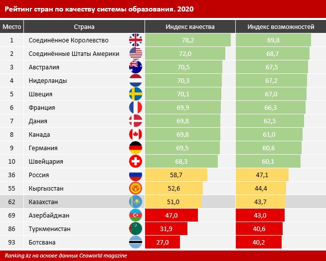 Казахстан занял 62-е место в рейтинге стран по качеству системы образования.