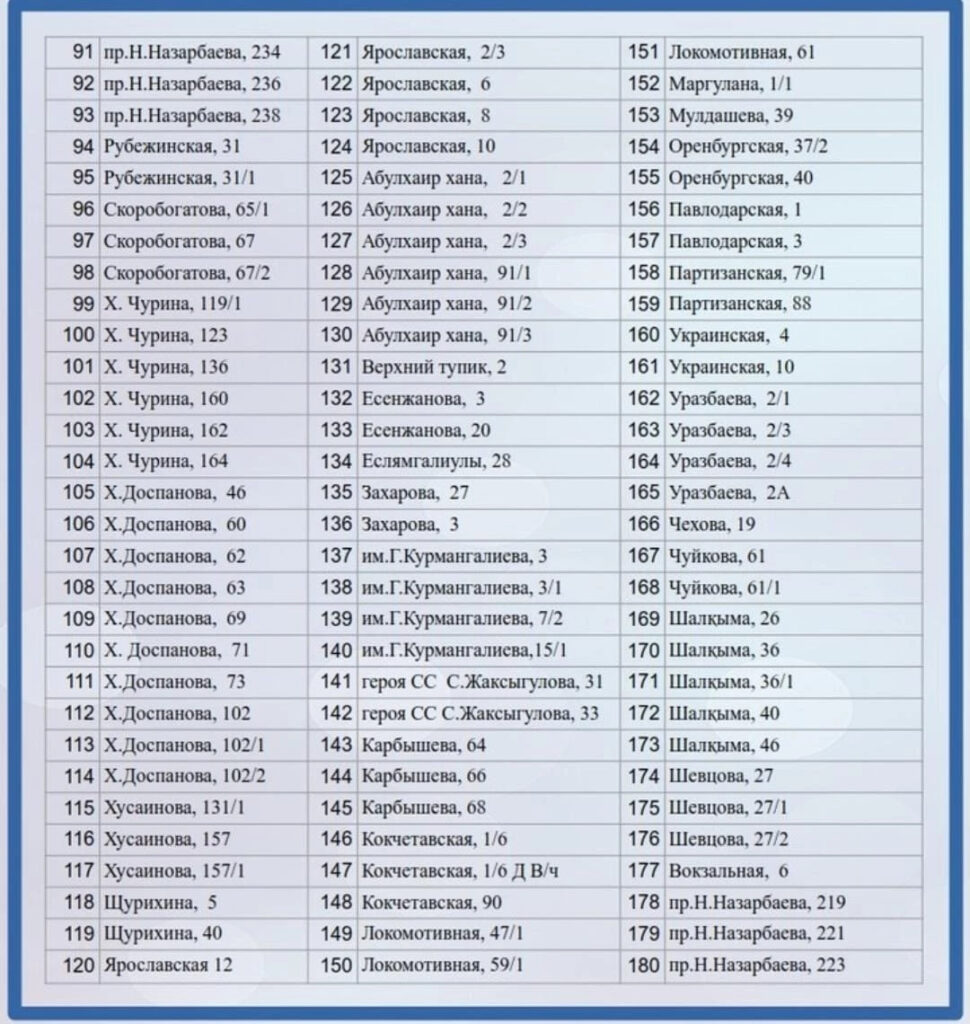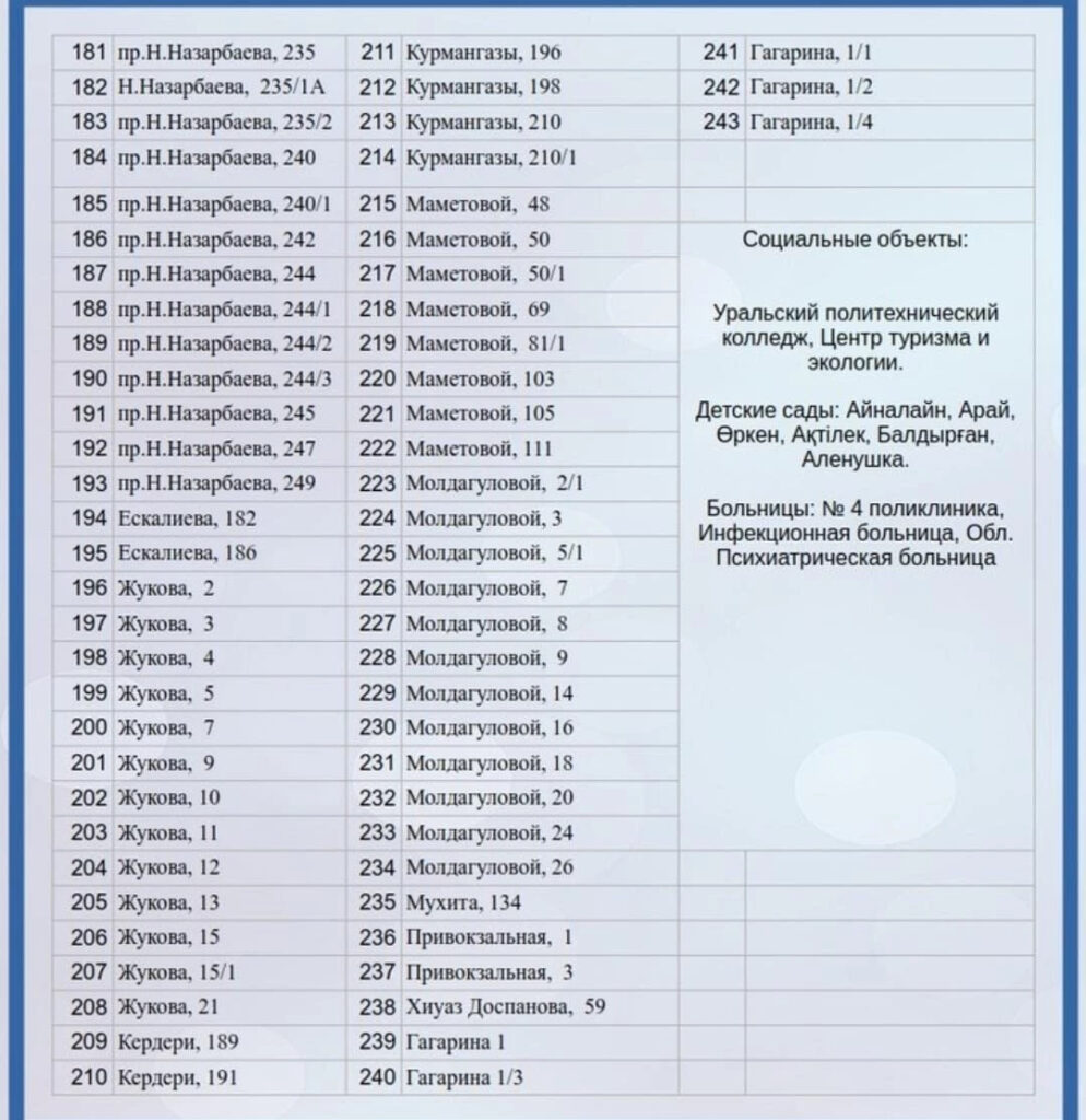 Без горячей воды останутся такие социальные объекты, как Уральский политехнический колледж, центр туризма и экологии, детские сады «Айналайын», «Арай», «Өркен», «Ақтілек», «Балдырған», «Аленушка», поликлиника №4, инфекционная больница и областная психиатрическая больница.