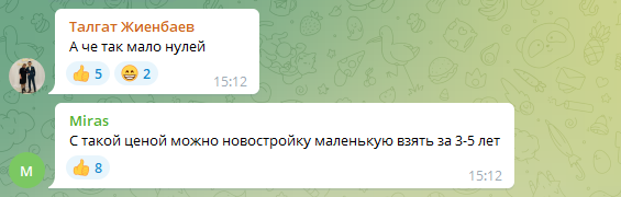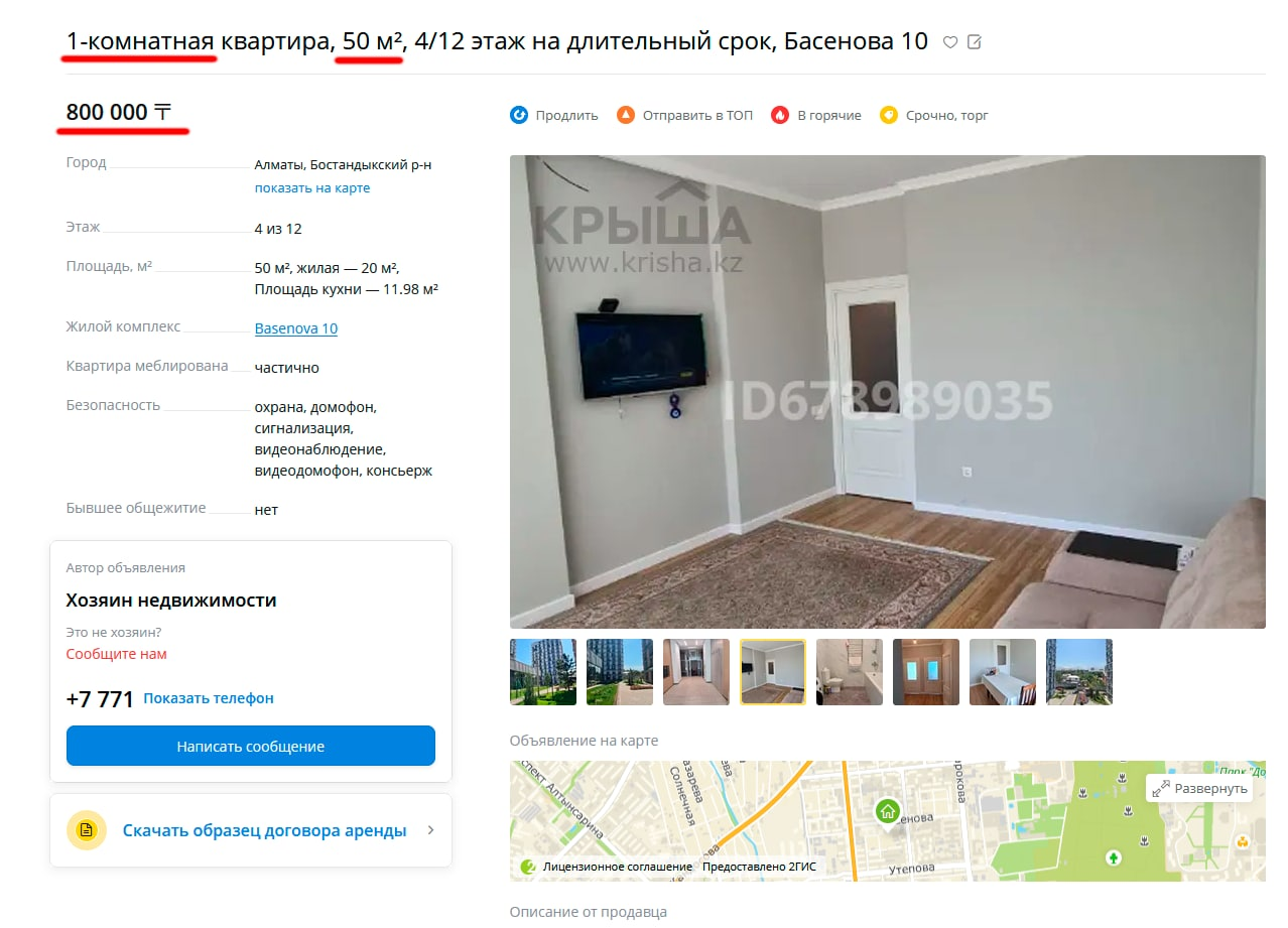 В телеграм-канале qumash_kz выложили скриншот объявления о сдаче в аренду однокомнатной квартиры в Алматы за 800 тыс. тенге в месяц. Также в паблике сообщили, что позвонили хозяину и узнали, что в эту сумму не входят коммунальные услуги.