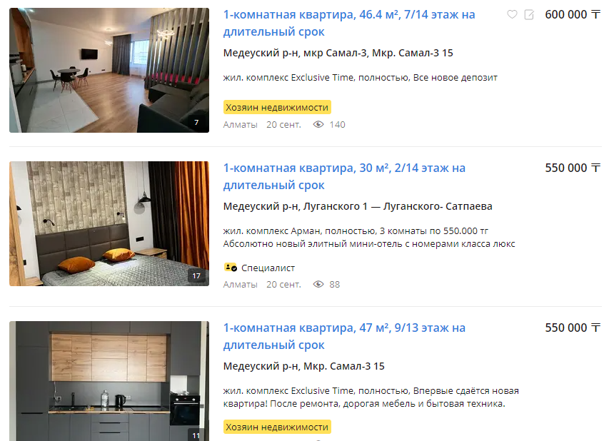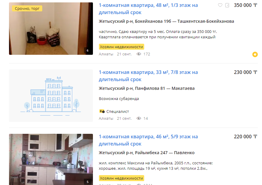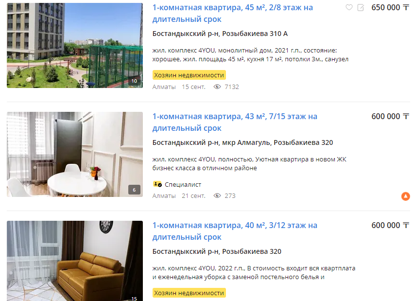 Мы решили сами проверить и такого объявления на сайте не нашли, однако нашли двадцать пять квартир в том же Бостандыкском районе стоимостью в 400-650 тыс. тенге: