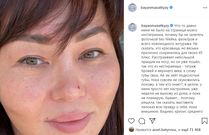 "Что-то давно меня не было на странице моего "Инстаграма", почему бы не залететь фоточкой без мейка, фильтров и всего новомодного антуража. Не сказать, что красавица, но весьма прилично сохранилась для своих 45 плюс", — подписала фото Баян Максатовна.