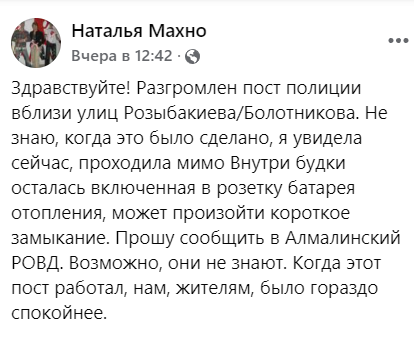 "Здравствуйте! Разгромлен пост полиции вблизи пересечения улиц Розыбакиева и Болотникова. Не знаю, когда это было сделано, я увидела сейчас, проходила мимо Внутри будки осталась включенная в розетку батарея отопления, может произойти короткое замыкание. Прошу сообщить в Алмалинский РОВД. Возможно, они не знают. Когда этот пост работал, нам, жителям, было гораздо спокойнее", — написала жительница Алматы.