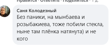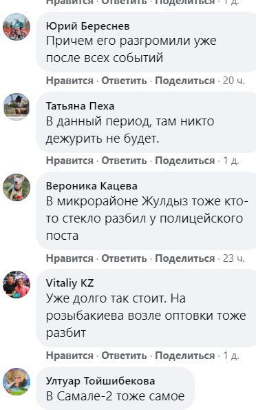 "На Мынбаева и Розыбакиева, тоже побили стекла, ныне там плёнка натянута и никого",  "В данный период там никто дежурить не будет", "В микрорайоне Жулдыз тоже кто-то стекло разбил у полицейского поста", "В Самале-2 тоже самое" "Уже долго так стоит. На Розыбакиева возле оптовки тоже разбит", — пишут участники группы.