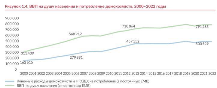 С 2006 по 2021 год валовой внутренний продукт (ВВП) на душу населения вырос с 549 тыс. до 791 тыс. тенге (в фиксированных единицах нацвалюты), а потребление домохозяйств на душу населения (в постоянных ценах) увеличилось с 280 тыс. до 500 тыс. тенге