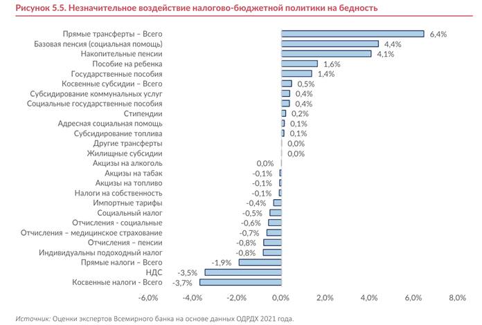 «… распределительное воздействие налогово-бюджетной политики в Казахстане является низким по сравнению с другими странами с уровнем доходов выше среднего. Значительное воздействие в таких странах, как Испания, Соединенные Штаты, Мексика и Польша, демонстрирует потенциал налогово-бюджетной политики для перераспределения ресурсов и содействия инклюзивному росту. Если пенсии считаются отложенным доходом, то налогово-бюджетная политика вызывает увеличение масштабов бедности с 13,9 до 18,3 %».