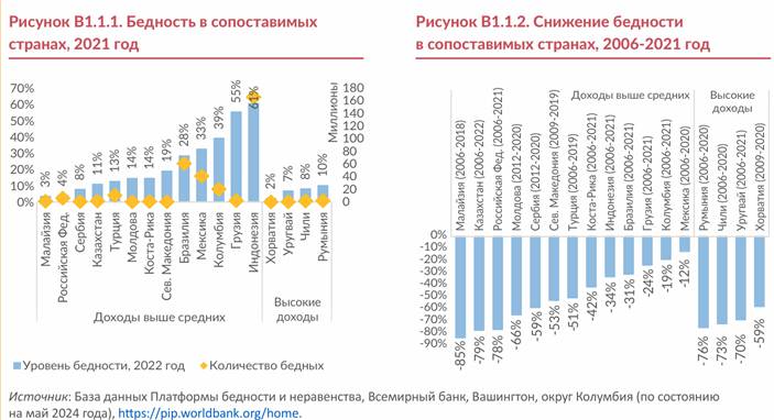 После достижения значительного прогресса в снижении бедности уровень бедности в Казахстане стал умеренным по сравнению с сопоставимыми странами с уровнем доходов выше среднего, но выше, чем у сопоставимых стран с высоким уровнем доходов.