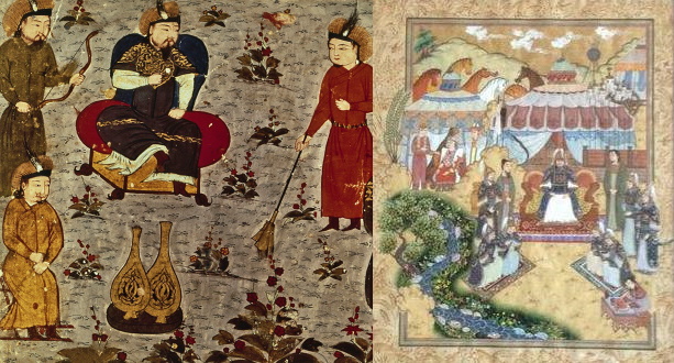 Чингисхана часто изображали на особом помосте, который исследователи считают походным вариантом трона. Помост был достаточно большим, чтобы вместить двух человек, и отличался богатой отделкой из дорогой, ярко окрашенной ткани и расписных деревянных бортов.