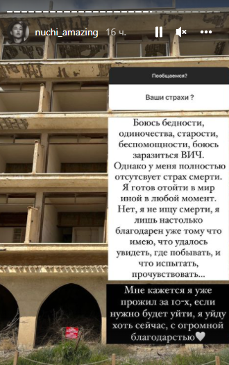 Алимходжаева спросили, какие у него есть страхи, и блогер ответил: "Боюсь бедности, одиночества, старости, беспомощности, боюсь заразиться ВИЧ. Однако у меня полностью отсутствует страх смерти. Я готов отойти в мир иной в любой момент. Нет, я не ищу смерти, я лишь настолько благодарен уже тому, что имею, что удалось увидеть, где побывать и что испытать, прочувствовать… Мне кажется, я уже прожил за десятерых, если нужно будет уйти, я уйду хоть сейчас с огромной благодарностью".