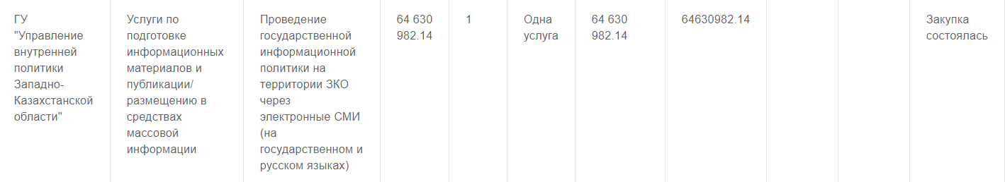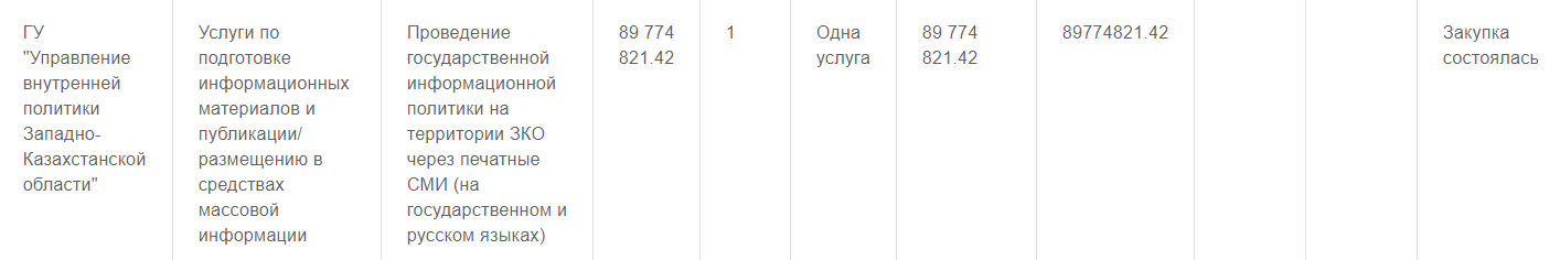 В феврале текущего года управление внутренней политики Западно-Казахстанской области опубликовало тендер на закупку услуг по проведению государственной информационной политики на территории ЗКО через печатные СМИ. На эти нужды было выделено 89 774 821 тенге.