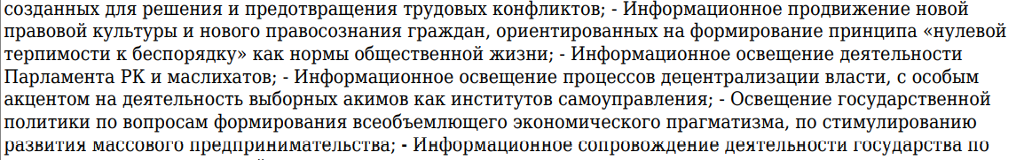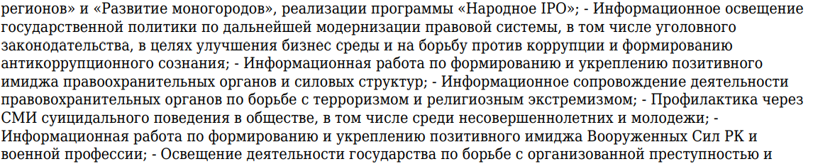 В описании тендера встречается несколько интересных формулировок. Например, через СМИ акимат намерен продвигать новую правовую культуру и правосознание граждан, ориентированных на принцип "нулевой терпимости к беспорядку", и особый акцент уделить деятельности выборных акимов.