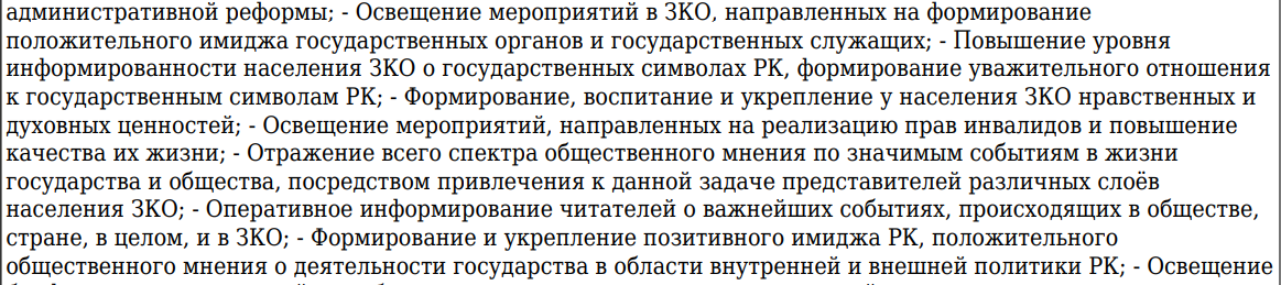 Речь идет о публикации имиджевых материалов в местных газетах, которые должны быть распространены в сельском округе каждого района Западно-Казахстанской области. Общий объем выпускаемых статей на казахском и русском языках должен составить 1 250 595 квадратных сантиметров.