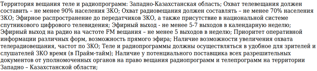 Темы для публикаций абсолютно идентичны, но в этот раз прописаны четкие установки по охвату населения и общему хронометражу эфира. Так, охват телевещанием должен составить не менее 90 процентов населения ЗКО, а радиовещания — не менее 70 процентов. Эфирный выход на телевидении должен осуществляться не менее 5-7 раз в неделю, а радиовещание — 5 раз в неделю. Кроме того, все передачи должны проходить в прайм-тайм.