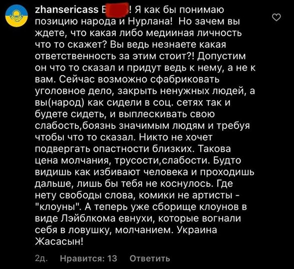 Одни из самых популярных российских стендап-комиков Нурлан Сабуров, являющийся уроженцем Степногорска, решил никак не комментировать свою позицию публично, за что нарвался на шквал критики от пользователей соцсетей.