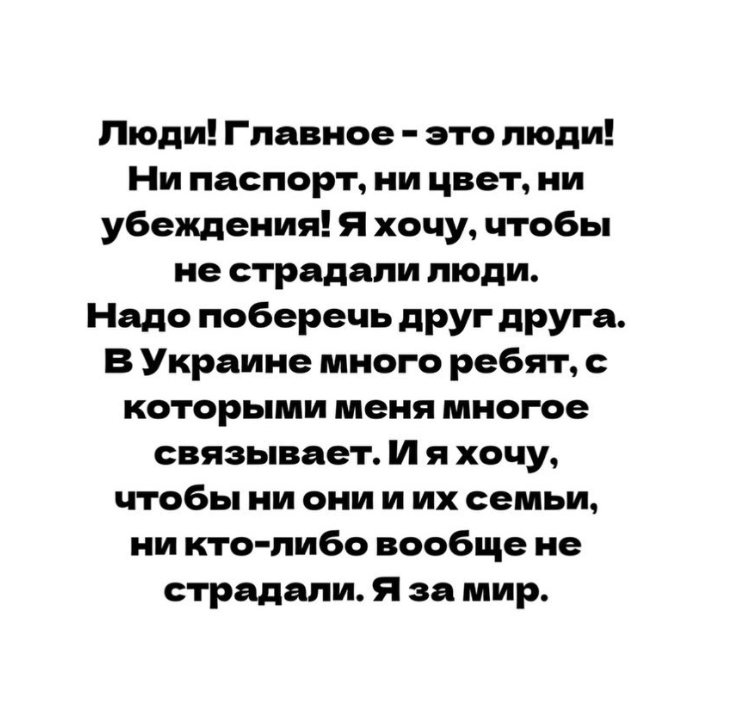 "Каждая женщина и каждый мужчина хотят иметь детей, растить сына и дочь. Каждый человек имеет светлые мечты, цель в жизни. Каждый имеет право жить и строить свое счастье. Мир спасёт доброта, взаимоуважение и любовь. Нет ценнее ничего человеческой жизни!Остановите кровопролитие! Нет войне!" — написал Димаш в публикации 1 марта.