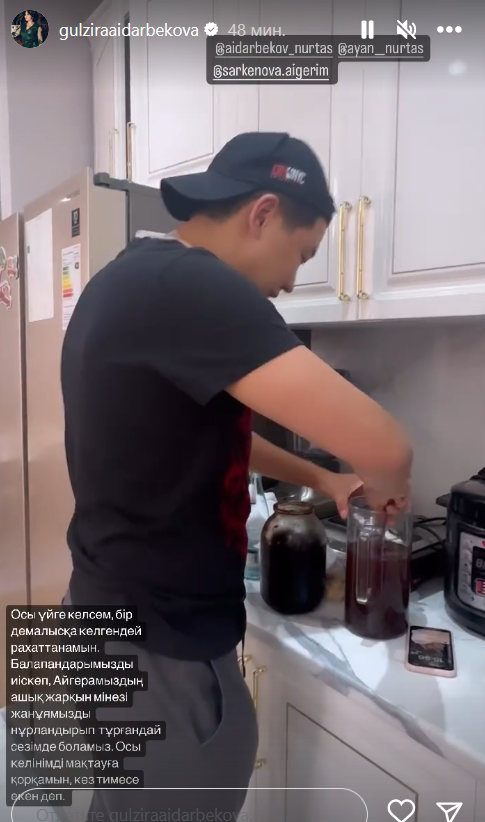 "Когда прихожу в этот дом, отдыхаю, как в отпуске. Внуков ненаглядных нюхаю, наслаждаюсь ощущением того, какую светлую и открытую атмосферу создает в семье Айгерим. Боюсь ее хвалить, чтобы не сглазили такую келин", — написала Гульзира Айдарбекова по этому поводу в сториз.