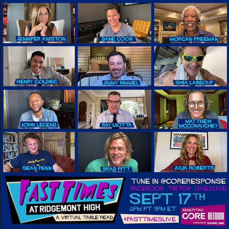 Сам выпуск выйдет в эфир 17 сентября, пока же организаторы опубликовали приманку — снимок экрана, где, помимо Джен и Брэда, участвуют Джулия Робертс, Мэттью Макконахи, Шайя ЛаБеф, Морган Фриман, Джимми Киммел, Генри Голдинг, а также Шон Пенн, который как раз сыграл одну из главных ролей в "Беспечные времена в "Риджмонт Хай". Онлайн-трансляция инициативы пройдет на страницах благотворительной организации Пенна CORE в соцсетях, все пожертвования от чтений пойдут на благотворительность.