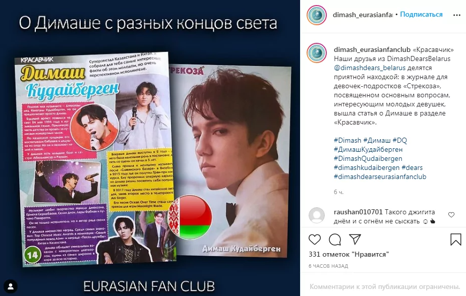 Белорусский журнал для подростков «Стрекоза» рассказал о казахстанце в разделе «Красавчик». Редакция постаралась осветить все вопросы, которые сыпались от юных поклонниц в адрес журнала.