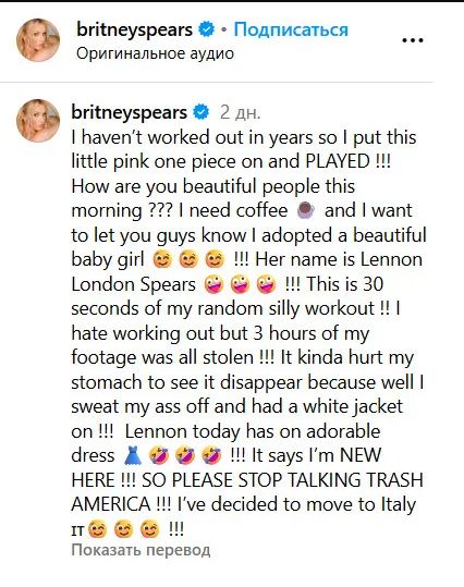 «Я хочу, чтобы вы знали, что я удочерила прекрасную девочку! Ее зовут Леннон Лондон Спирс», – рассказала певица и добавила, что Леннон сегодня надела «очаровательное платье».