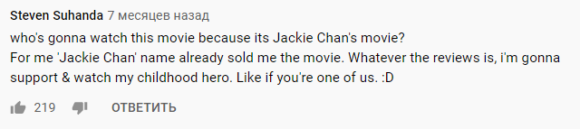 "Джеки Чан один из моих любимых китайских актеров. Планирую посмотреть этот фильм только из-за него!"