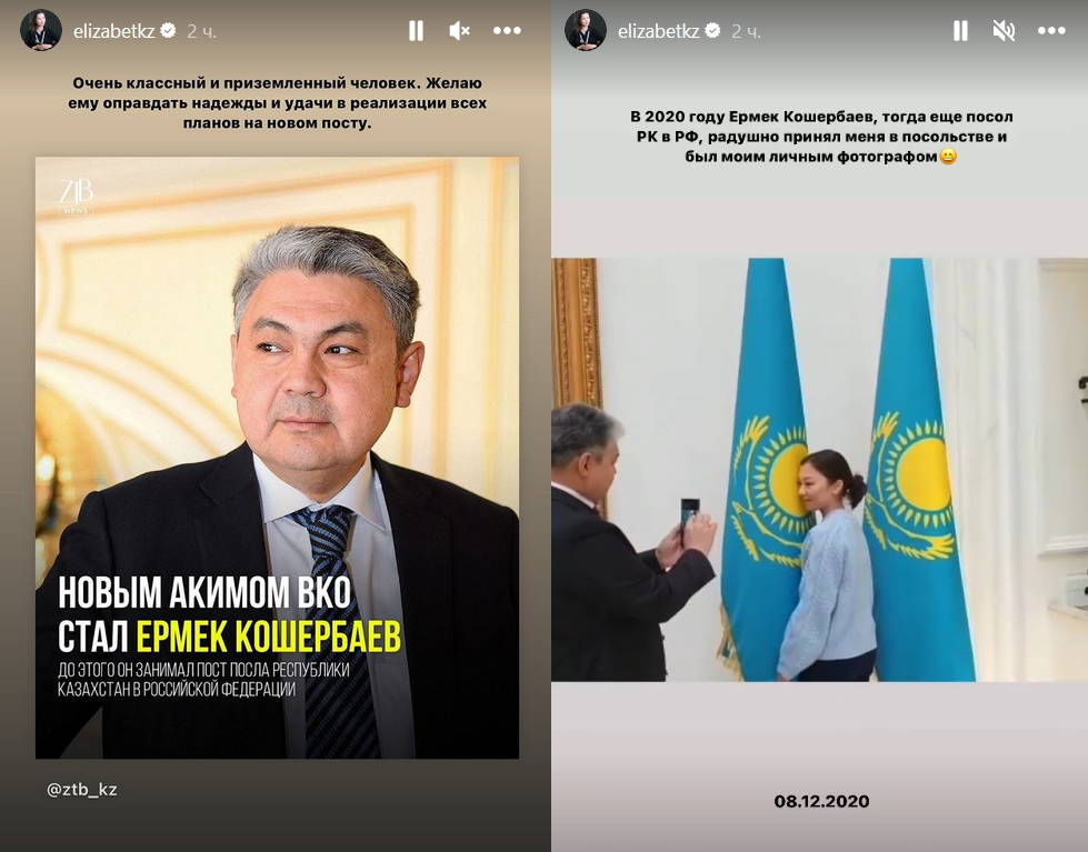 В 2020 году Ермек Кошербаев, тогда еще посол РК в РФ, радушно принял меня в посольстве и был моим личным фотографом. 8 декабря 2020 года" , — написала Элизабет.
