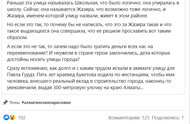 "Раньше эта улица называлась Школьная, что было логично: она упиралась в школу. Сейчас она называется Жазира, что, возможно, тоже логично, и Жазира, именем которой улицу назвали, живет в этом районе. Но если это так, то почему бы не написать, что это за Жазира такая и что такое выдающееся она совершила, что ее решили прославить вот таким образом. А если это не так, то зачем надо было тратить деньги всех нас на переименование? И неужели в стране герои закончились, дела которых достойны носить улицы города?