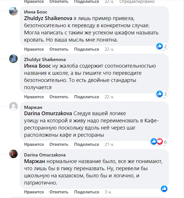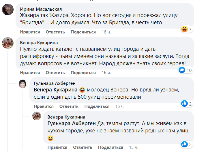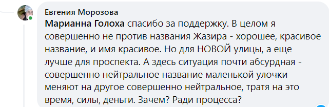 "В целом я совершенно не против названия Жазира — хорошее, красивое название, и имя красивое. Но для НОВОЙ улицы, а еще лучше для проспекта. А здесь ситуация почти абсурдная — совершенно нейтральное название маленькой улочки меняют на другое совершенно нейтральное, тратя на это время, силы, деньги. Зачем? Ради процесса?", — уточнила автор публикации.