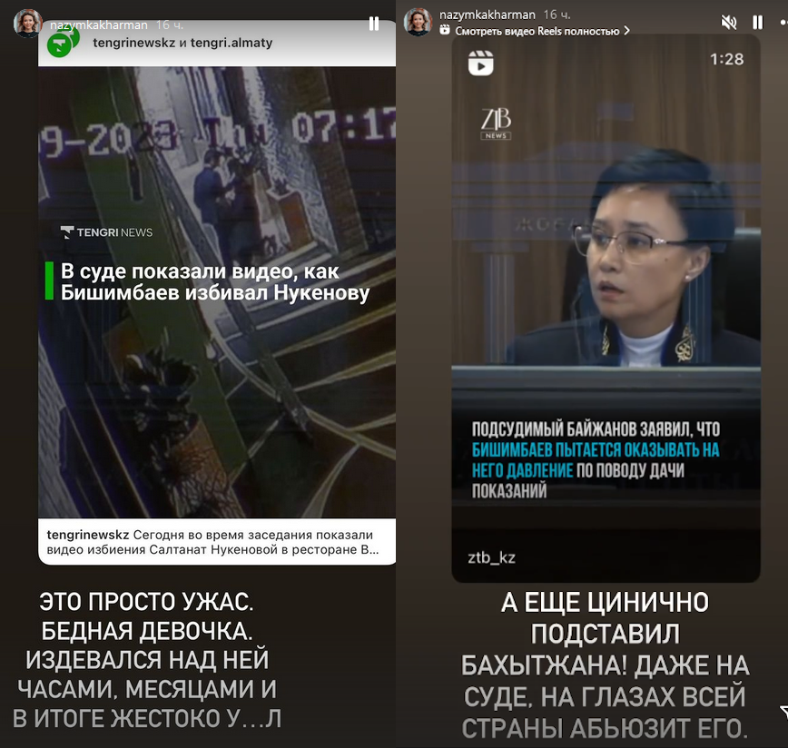 "Это просто ужас, бедная девочка. Издевался над ней часами, месяцами и в итоге жестоко убил. А еще цинично подставил Бахытжана! Даже на суде, на глазах всей страны абьюзит его", — написала Назым Кахарман, бывшая жена Куандыка Бишимбаева.