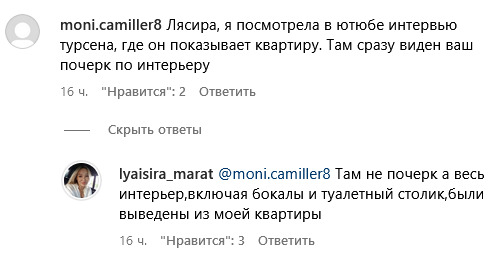 "Ляйсира, я посмотрела на YouTube интервью Турсена, где он показывает квартиру. Там сразу виден ваш почерк в интерьере", — написала одна из подписчиц.