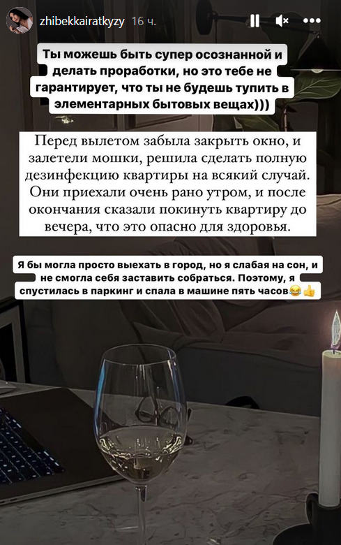 Я бы могла просто выехать в город, но я слабая на сон и не смогла себя заставить собраться. Поэтому я спустилась в паркинг и спала в машине пять часов" , — поделилась Жибек.