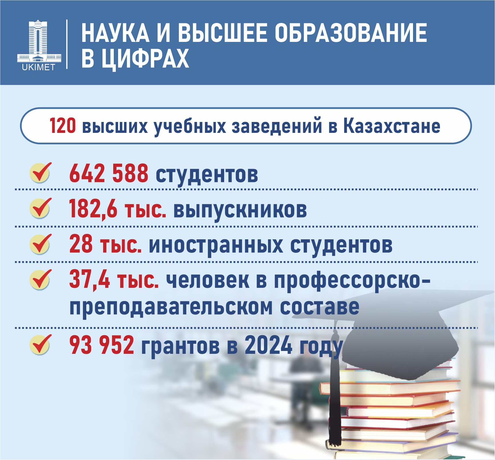 В настоящее время в Казахстане функционирует 120 высших учебных заведений. Обучаются в них 642 588 человек, по госзаказу — 255 685, 37,4 тыс. человек составляет профессорско-преподавательский состав.
