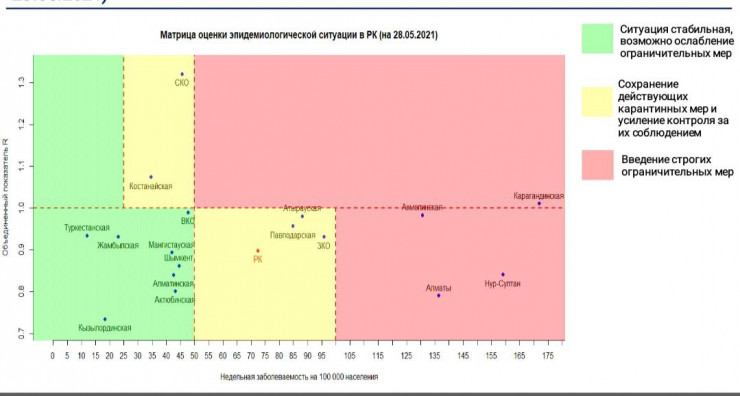 В "зеленой" зоне — г. Шымкент, Алматинская, Актюбинская, Восточно-Казахстанская, Жамбылская, Кызылординская, Мангистауская и Туркестанская области.