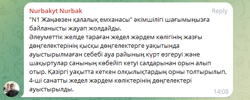 "Администрация Жанаозенской городской больницы №1 в связи с вашей жалобой поясняет.