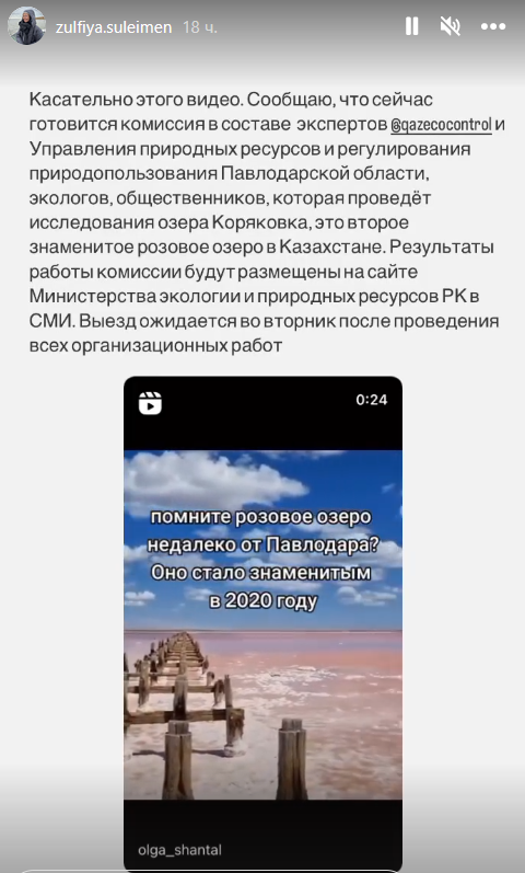 "Сообщаю, что сейчас готовится комиссия в составе экспертов и Управления природных ресурсов и регулирования природопользования Павлодарской области, экологов, общественников, которая проведет исследования озера Коряковка, это второе знаменитое розовое озеро в Казахстане.