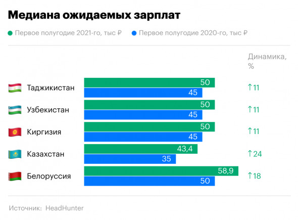 «Первая волна пандемии повлекла за собой снижение миграционного прироста: работники из стран Средней Азии стали массово возвращаться домой. И, как мы видим по динамике резюме, обратный тренд летом 2021 года еще даже не наметился. Рост числа резюме соискателей из стран Средней Азии на 2 процента означает лишь, что отток прошлого года едва компенсировался», — указала Данина. Она напомнила, что регулярные авиаперевозки между Россией и странами Средней Азии возобновились лишь в апреле 2021 года, а уже в мае «в полную силу заявила о себе третья волна пандемии».