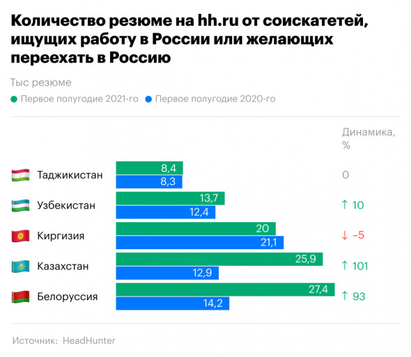 Росло лишь количество резюме от соискателей из Казахстана и Белоруссии. Но, как пояснила директор департамента аналитических бизнес-решений HeadHunter Наталья Данина, в большинстве случав соискатели из этих стран рассматривают вакансии в профессиях белых воротничков и могут работать удаленно, тогда как в качестве рабочего, строительного, административного персонала обычно привлекают мигрантов из Средней Азии.