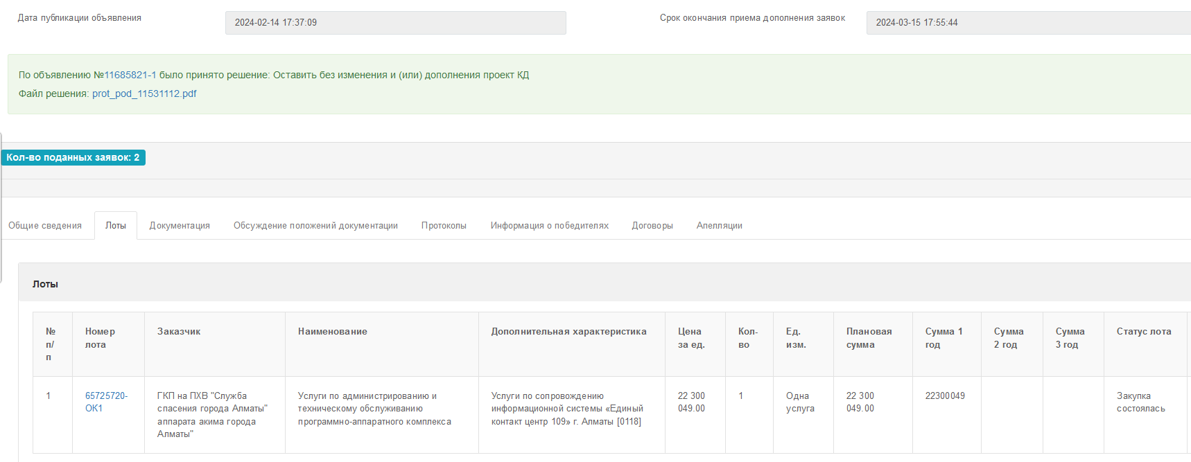 Во-первых, служба спасения города Алматы потратила более 22 млн тенге на «Услуги по сопровождению информационной системы «Единый контакт центр 109» г. Алматы [0118]».