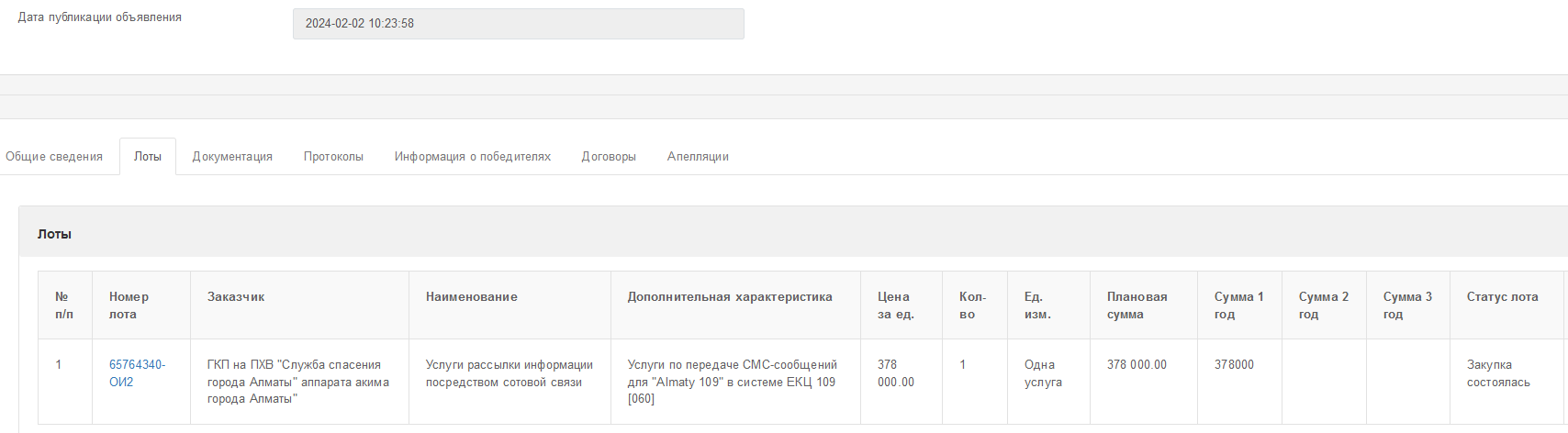 Еще 378 тыс. служба выделила на «Услуги по передаче СМС-сообщений для "Almaty 109" в системе ЕКЦ 109 [060]».